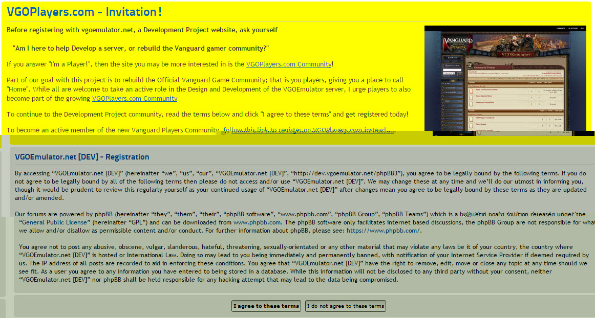 Just an FYI; I have made a small change to the Registration page for the Developer forums (this site) in an effort to raise awareness that there is a Player Community being built @ [url=http://vgoplayers.com:25zx2ak3]VGOPlayers.com[/url:25zx2ak3].