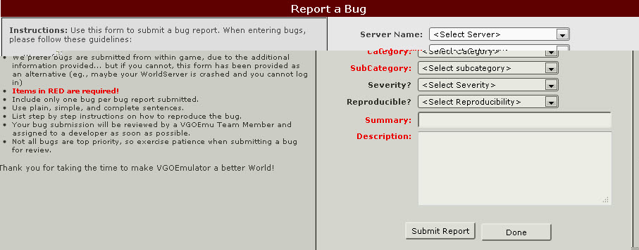Aside from the in-game bug report, the web portal will have a dialog like this (already developed) I am hoping to use the VGOPlayers.com integration to link bug reports to active accounts, so players can manage their own bug reports as well (see them, update them, cancel them, etc). Though this is a long ways off, because pretty much everything is a bug right now... all 2 features