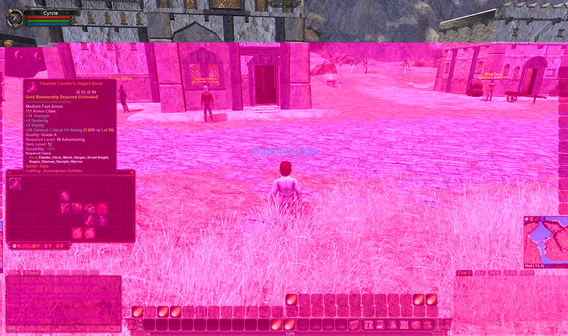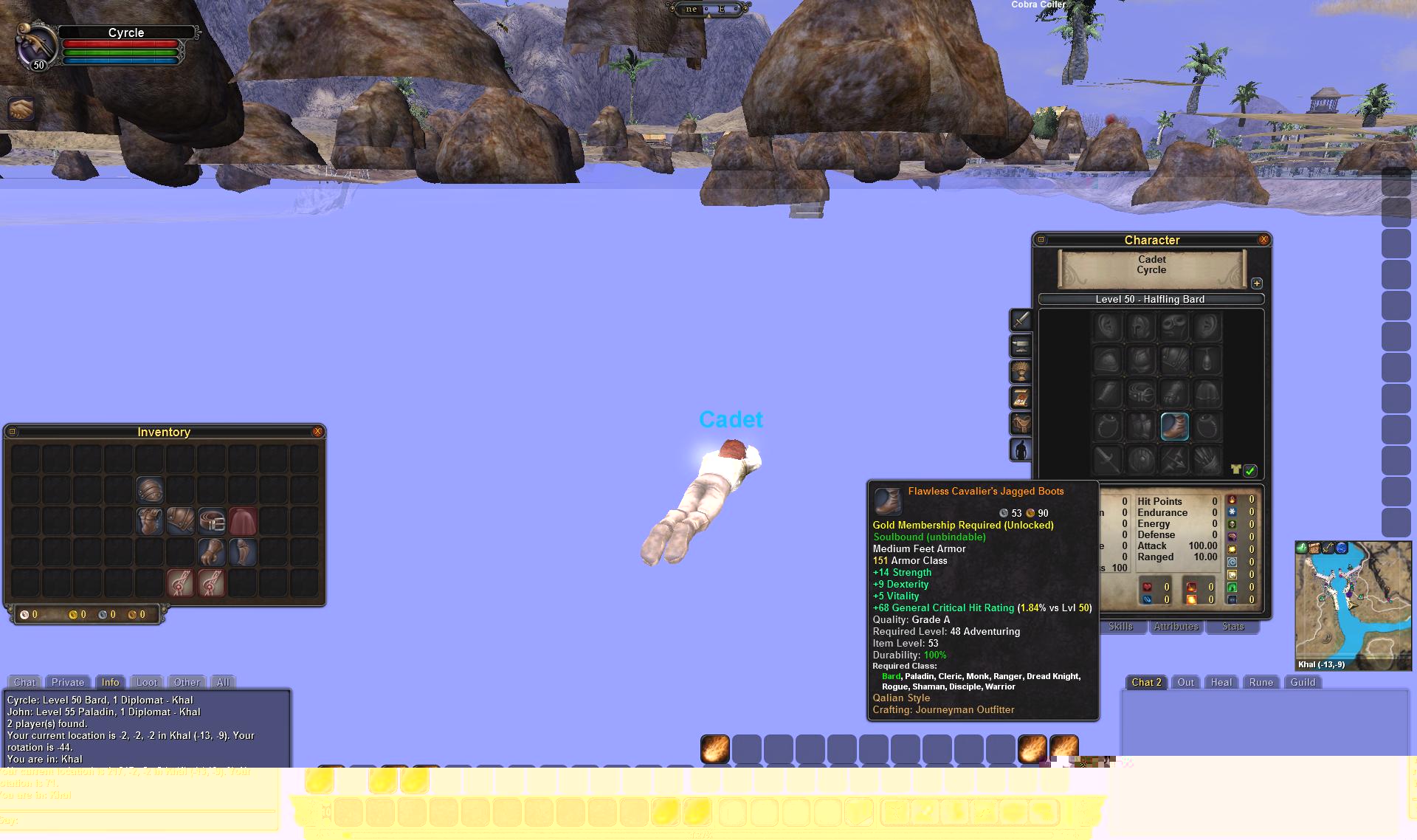 I added item # 799123 (Flawless Cavalier's Belt of Renewal) to my inventory and equipped it by right clicking on the item in my bags. I then right clicked the belt on my character sheet to take it off (to see the difference in appearance - if there was one). I was then instantly ported under the ground, in the water in Khal, swimming. I no longer can control my character. I can .rift to any zone and it will put me under the world in the water, swimming in a forward motion. Closing the game and reopening it, does not fix this issue. I still have no control over my chracter (still moving in forward swimming motion). Also, my character no longer has his correct name above his head (should be "Cyrcle"). It is now just a square box.