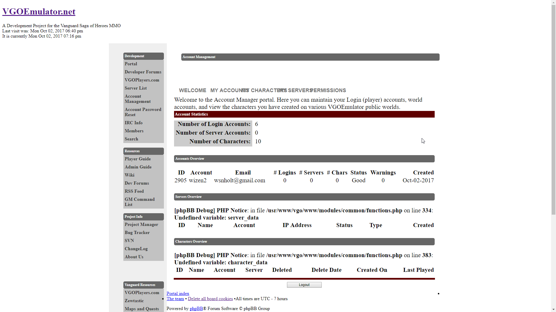After creating 4 additional accounts (In order, wizen2 (wizen2@wizen.33mail.com then changed through the UI to the same email as my forum account), for(i = 3; i < 6; i++){println("wizen" + i);}), the page started to look a little screwed up and wasn't listing off all my accounts and characters as it was intended to do.