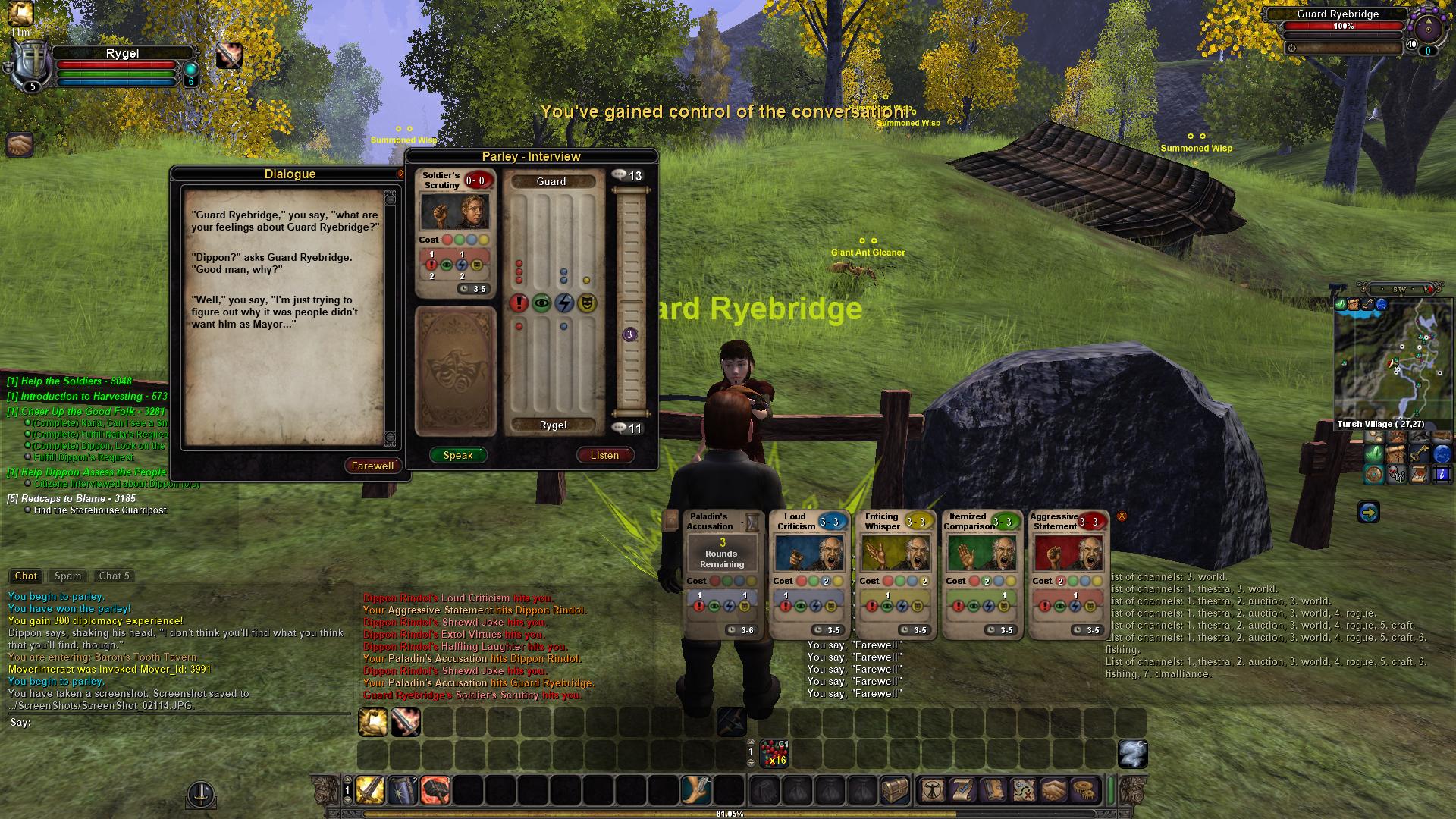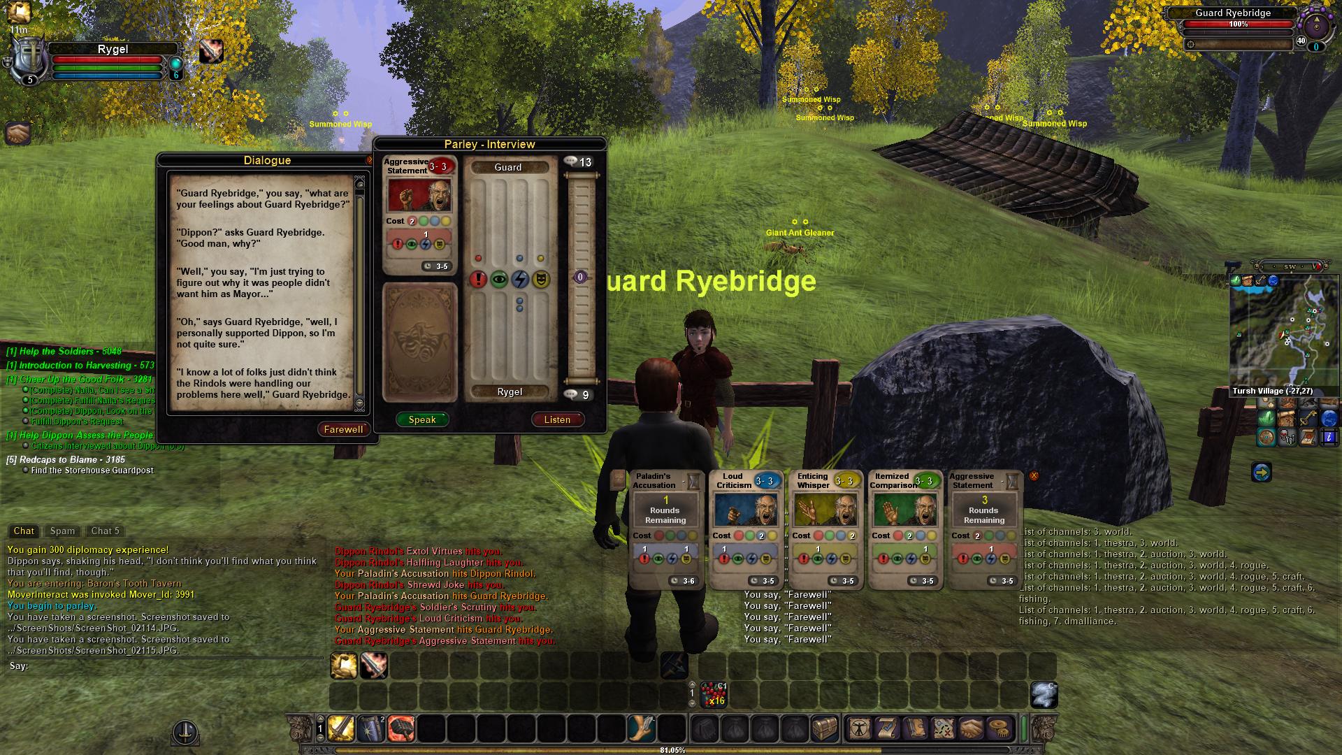 I was doing some questing in Tursh (Adventuring, Crafting, Diplomacy). I noticed in some quests that my character's first name was being used in place of an NPC's first name in the text being displayed. My toon's name is Rygel