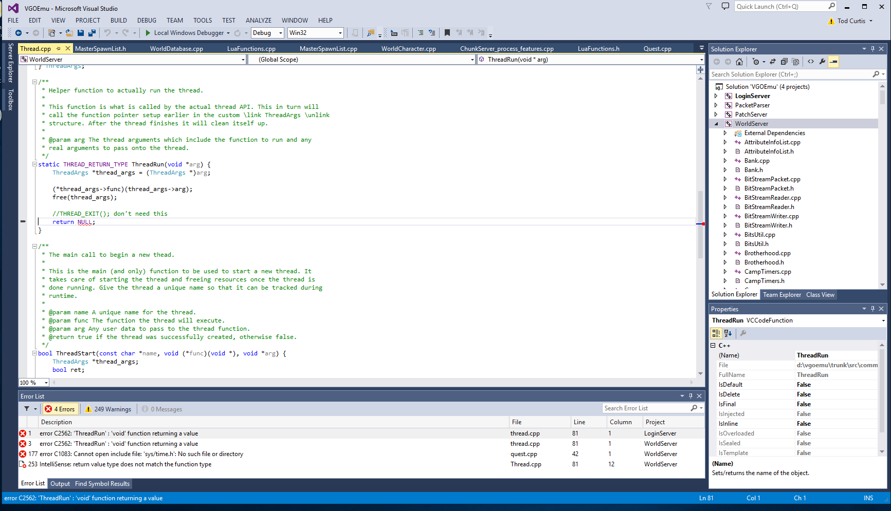 I can comment out the quest.cpp include for sys/time.h and the return NULL in thread.cpp and am ok for now.