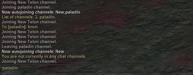 I didn't do autojoin either. at least not intentionally. All I was doing was clicked New Telon, spoke a little, saw it, then clicked Paladin and it told me it was "3" which is what New Telon was previously. Assuming it bumped the channel. /3 now became "paladin" and I couldn't do any more with New Telon. If I unchecked paladin, it said all channels were gone (screen shot)